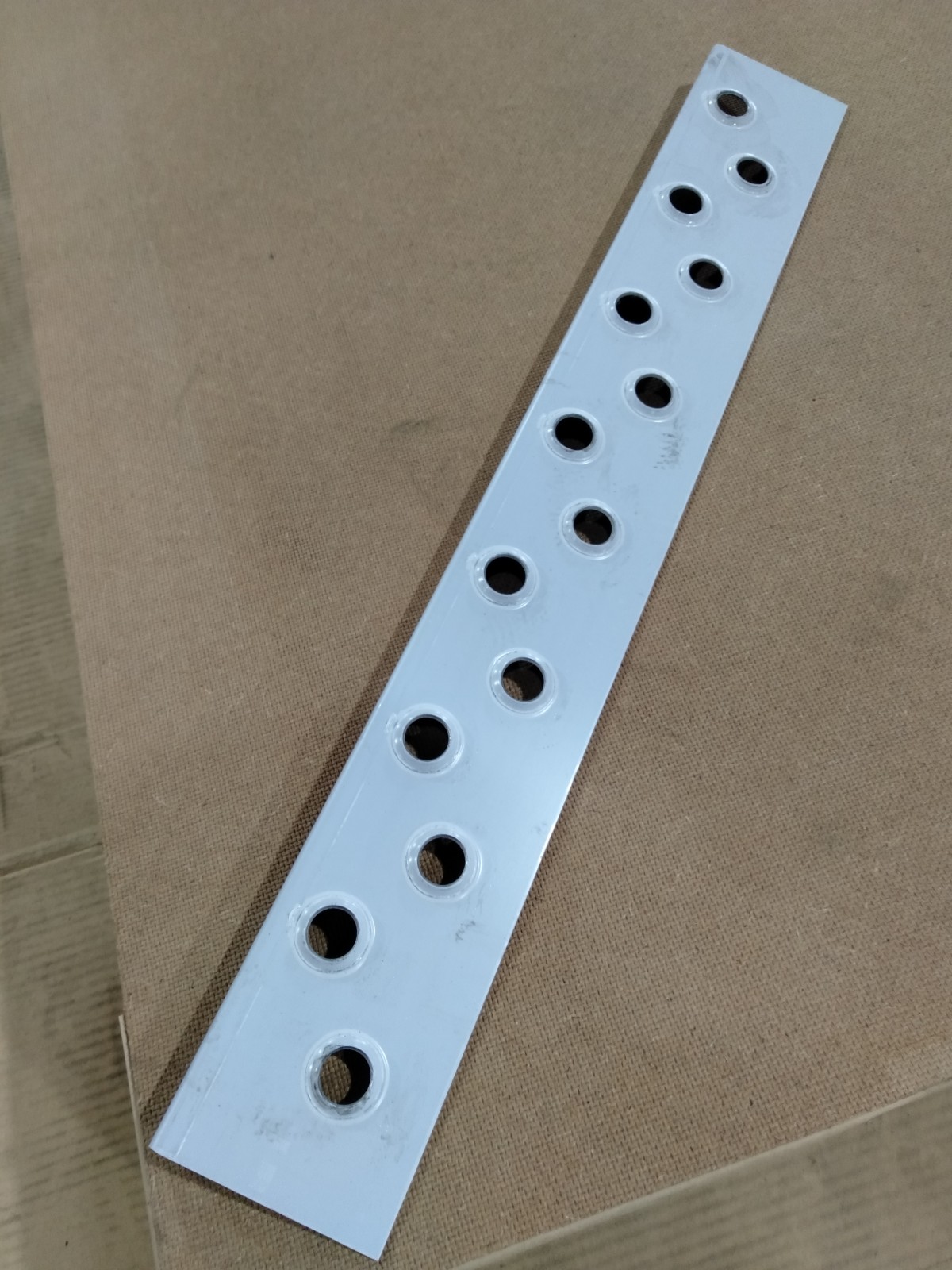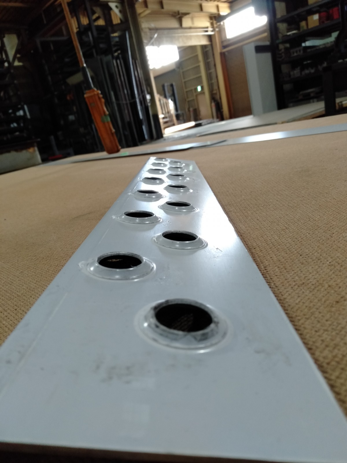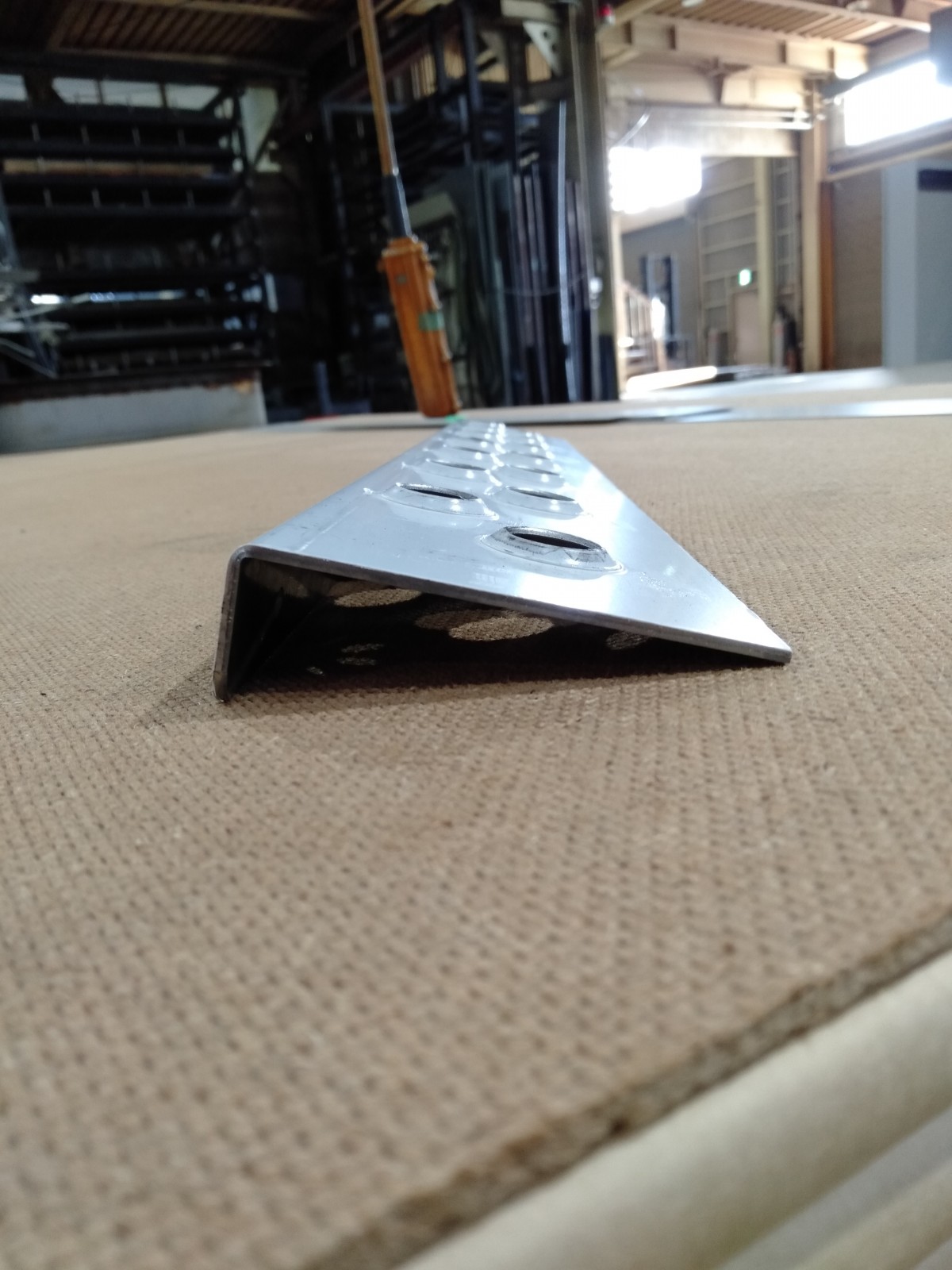 製品用途は滑り止めですが、シャーリング切断・タレットパンチプレスでの打ち抜きと成形・ベンディング曲げと当社の加工機を駆使した加工となっております。